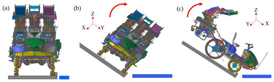 Simulation provides valuable solutions by giving clear insights into complex systems instead of testing the initial prototype or system physically. It solves real-world problems safely and efficiently. In this study, a simulation was also carried out to determine the static rollover characteristics of the onion transplanter using commercial software (Recurdyn V9R4, FunctionBay, Gyeonggi-do, Republic of Korea) considering the different mounting positions of the transplanting unit and load conditions. A three-dimensional model of the developed onion transplanter was provided by the manufacturer, which was prepared using the SolidWorks software and imported into Recurdyne for simulation purposes. The seedling carrying racks were not included in the 3D model; however, relevant weight was added at the specific point during simulation. All the required properties were defined in the Recurdyn software before initiating the simulation. Figure 4 shows the simulation steps for determining the static (lateral and longitudinal) rollover angles.