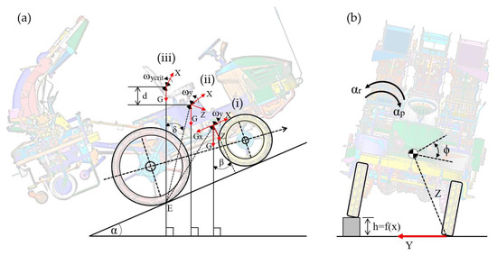 During driving, any wheel of the onion transplanter may come into contact with incompressible impediments. Ahmadi [40] developed a model to determine the rollover angle in this situation. Figure 6b shows the transplanter’s rolling and pitching velocity and acceleration under this circumstance. The physical properties of the obstacle can be defined by the h = f(x) function. The critical height of the CG caused by the obstacle can be calculated using Equation (20).