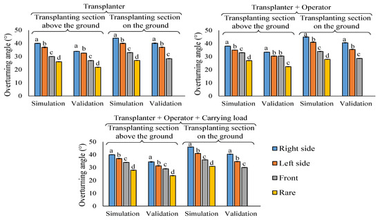 Simulation and validation of the lateral and longitudinal rollover angles of the onion transplanter system under different load conditions and the mounted status of the transplanting unit. Here, a, b, c, d: different letters indicate significant differences (p ≤ 0.05).