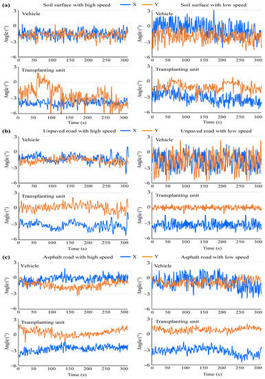 The fluctuation of angles for different driving surfaces and speeds is shown in Figure 9. The average angle fluctuation of the vehicle and transplanting unit during driving on the soil surface was 4° and 6°, respectively, for both high and low driving speeds. However, the average fluctuating angle of the vehicle under the unpaved road condition was the same (4°), and a low fluctuation was observed (2°) for the transplanting unit. The separated X- and Y-axes indicate that the transplanting unit was mounted in a tilted condition while driving the onion transplanter. An almost similar situation was observed in the asphalt road condition. Although the obtained signal patterns differed slightly for each condition, there was no significant difference between the high and low driving speeds. The angle fluctuation pattern was primarily influenced by the driving surface condition for both the vehicle and transplanting unit.