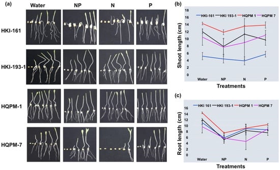 The HQPM-7 genotype showed 71.43% germination in presence of both NP and P but 28.57% in presence of N (Figure 1a). The seedling measurements showed that in presence of P or NP there was no significant change in shoot length, but the size decreased slightly in presence of N (Figure 1b). In roots, the length decreased slightly in presence of P and by 4 cm in presence of NP but 5 cm in presence of N (Figure 1c).