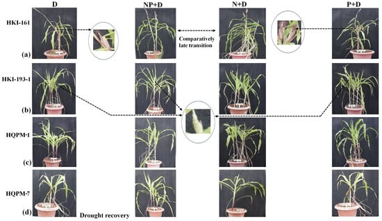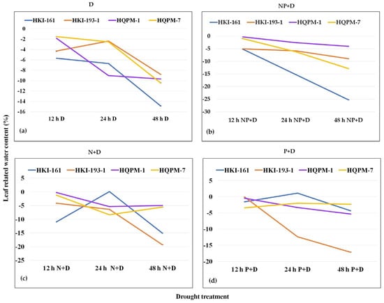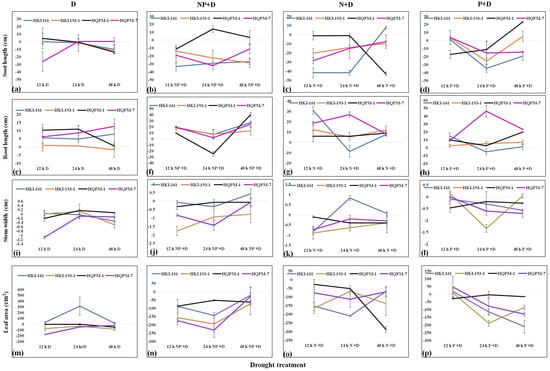 In the drought-stressed HKI-161 seedlings, the leaf area decreased significantly in presence of N and/or P (Figure 2n–p) at 24 h. Thereafter, it increased at 48 h of drought stress in presence of NP and N (Figure 2n,o) but decreased further in presence of P (Figure 2p).