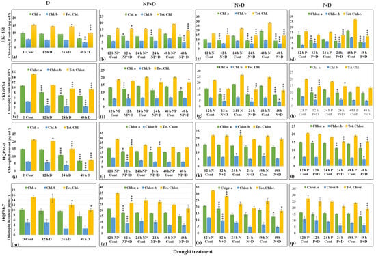 The effect of nutrient application on the chlorophyll content of maize seedlings under control (cont) and drought stress (D) conditions without or with pre-supplementation with nitrogen (N) and/or phosphorous (P). The graphs show average values of changes in HKI-161 (a–d), HKI-19-1 (e–h), HQPM-1 (i–l) and HQPM-7 (m–p) maize genotypes. The mean values and standard error obtained using three biological replicates are plotted. Asterisks indicate significant statistical differences: *** p < 0.001, ** p < 0.01, * p < 0.05.