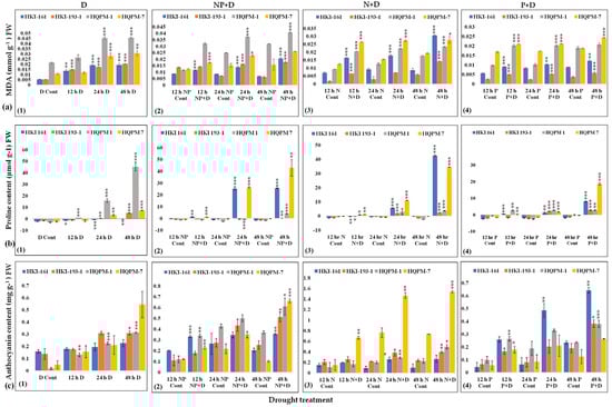 The effect of nutrient application on the (a) MDA, (b) free proline and (c) anthocyanin content in drought stressed (D) maize seedlings pretreated Nitrogen (N) and/or Phosphorous (P), respectively in the four genotypes. Subfigures show the respective response under drought stress (1) without nutrient pre-supplementation, (2) pre-treatment with NP, (3) pre-treatment with N and (4) pre-treatment with P. Bars represent the mean values and standard error obtained using three biological replicates. Asterisks indicate significant statistical differences: *** p < 0.001, ** p < 0.01, * p < 0.05.