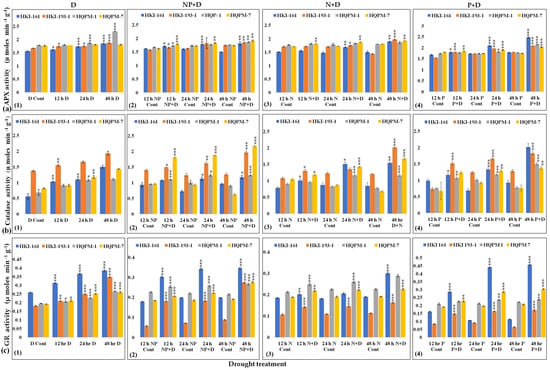 In HQPM-7 seedlings, the root length was longer as compared to drought stress controls at 12 h in the presence of N and/or P (Figure 2f–h). In the presence of NP, the root length decreased at 24 h but increased by 48 h (Figure 2f). In the presence of N or P, the root length increased at 24 h but increased by 48 h (Figure 2g,h).