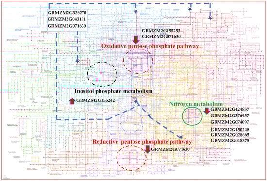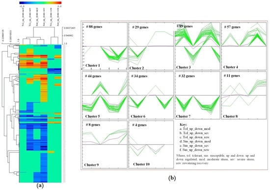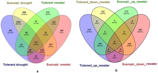 The data for drought tolerant and drought susceptible maize genotypes were downloaded from EXPath 2.0, a comparative expression analysis inferring metabolic pathway analysis tool []. The differentially expressed transcripts (DETs) under drought stress, and stress recovery conditions were filtered by setting cutoff parameters of fold change: ≥3 and p-value: ≤0.05. The selected DETs were used to generate the heat map and metabolic profiles and predict gene ontology (GO) and Kyoto Encyclopedia of Genes and Genomes (KEGG) pathways. To know the distribution patterns of the DETs Venny 2.1 (http://bioinfogp.cnb.csic.es/tools/venny/) and DrawVenn (https://bioinformatics.psb.ugent.be/webtools/Venn/) were used.