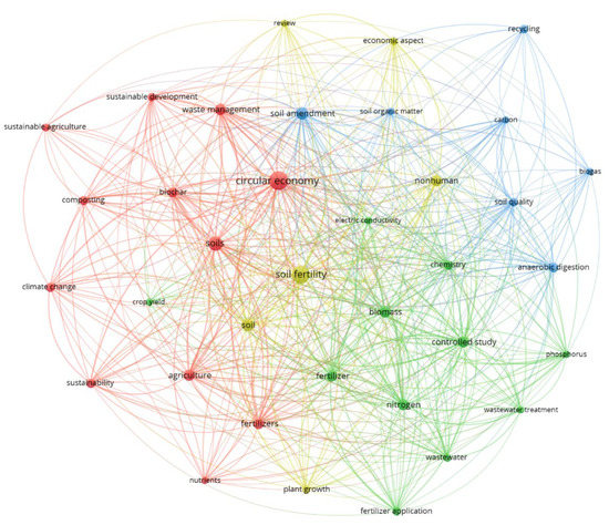 Co-occurrence network map of the most used keywords related to “circular economy” and “soil fertility” in the documents indexed by Scopus, 2016–2022.