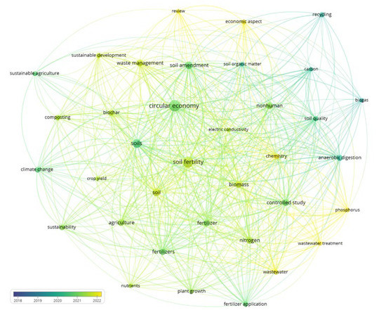 Chronology map of the keywords related to “circular economy” and “soil fertility” in the documents indexed by Scopus, 2018–2022.