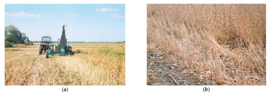 View of the field after the passage of the harvesting machine with combing working units: (a) millet field, (b) soybean field.