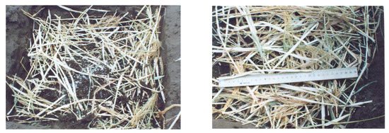 As an example, let us consider in more detail the layout of the first experiment. For the first experiment, the first two factors are at their upper levels, and the third is at its middle level (Table 1). This means a straw length of 0.4 m, a nitrogen application dose of 20 kg/t (which is 9 g ammonium nitrate per pit), and a phosphorus application dose of 3 kg/t (2.4 g superphosphate per pit). After laying the straw and fertilizing, the pit was covered with soil and a plate with the number of experiences was installed. In the same way, all 15 experiments were laid, with a fivefold repetition of each one. At the end of the experiment (after 8 months), the pits were carefully excavated, the soil was sifted, and the leftover undecomposed straw (Figure 5) was weighed. The decomposition coefficient was calculated using Equation (1).