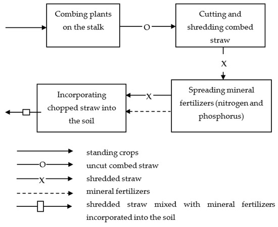 Thus, the studies of straw decomposition in the soil and their further analysis have led to the development of a technology for harvesting combed straw, the block diagram of which is shown in Figure 6.
