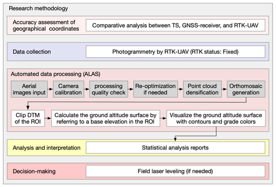 Our research methodology (Figure 5) consists of (1) an accuracy assessment of geographical coordinates measured between the TS, the GNSS-receiver, and the RTK-UAV; (2) data collection by the RTK-UAV photogrammetry; (3) automated data processing called ALAS from the aerial images to automated generation of the ground altitude surfaces of the target field; (4) analysis and interpretation for the field levelness; and (5) decision-making for field laser leveling.