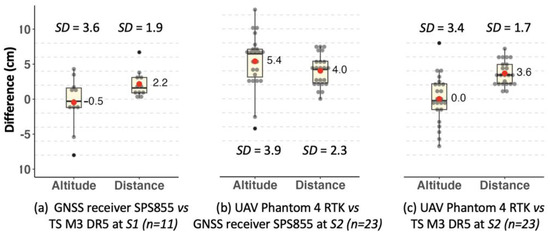 Figure 6 shows three groups of box-and-whisker diagrams depicting the differences measured between the TS, the GNSS-receiver, and the RTK-UAV instruments. Each diagram corresponds to one of the datasets of the comparison results at the measurement points and comprises six parts: the box denotes the interquartile range, the lower whisker represents the range to the minimum value, the upper whisker represents the range to the maximum value of the measurement data, the horizontal line drawn in the box midpoint denotes the middle value, and the outliers denote data outside the whisker boundary and gray dots denote data distribution. The red dots with labels represent the average difference values.