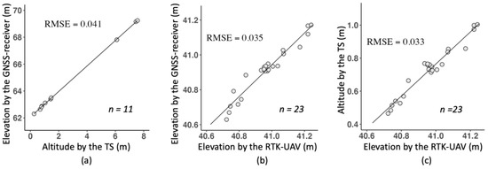 The results of RMSE comparisons between the TS, the GNSS-receiver, and the RTK-UAV are plotted in Figure 7a–c at the same corresponding study site in the subfigures of Figure 6a, Figure 6b, and Figure 6c, respectively. The RMSE value between the TS and the RTK-UAV at S2 (Figure 6c) reached 3.3 cm, which was slightly smaller than those in both Figure 7a 4.1 cm and Figure 7b 3.5 cm. Despite the instability of the elevation data when the RTK-UAV and the GNSS-receiver were used, the RMSE accuracy of Figure 7c demonstrated the high applicability for practical use cases without geo-referencing to GCPs, especially for typical lowland areas such as S2 and S3.