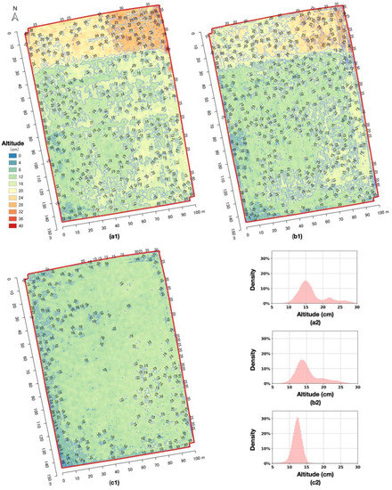 In the two fields F1 and F2 for land leveling, the ground altitude surfaces in centimeter units were generated by ALAS. Figure 8 depicts the levelness assessment results for F1 with an area of 1.5 ha. Figure 8(a1–c1) shows the generated ground altitude surfaces embedded with 5 cm contours and grade colors before the leveling, after the first leveling, and after the final leveling, respectively. Figure 8(a2–c2) shows the corresponding altitude histograms of the ground altitude surfaces. All the altitude values used in the figures were reduced by a minimum of 47.05 m from the DTM’s elevation.