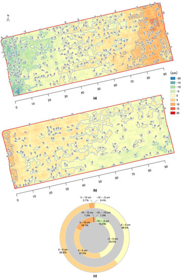 Since the same grade colors were used in both subfigures Figure 9a,b, the difference changes in the ground altitudes before and after land leveling differed significantly. The 5 cm contours also indicated these changes. The standard deviation of the ground altitudes was improved, as it was 2.1 cm after land leveling compared to the origin 4.6 cm before land leveling. As shown in subfigure Figure 9c, simultaneously, the colored doughnut parts of “−5–0 cm” and “0–5 cm” also remarkably increased after land leveling. The sum of the percentages between [−5, 5] cm increased from 71.0% before to 96.9% after land leveling, which exceeded the experience value of 95%.