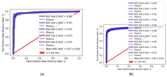 Confusion matrix (a) 5-fold; (b) 10-fold.