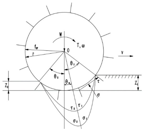 To establish the functional relationship between the hook traction FP, driving torque T, load W, and sinkage Z, Equations (2)–(10) are first linearized. Let θm be the maximum positive stress σmax and the maximum shear stress τmax at the bottom surface of the wheel in the contact range.