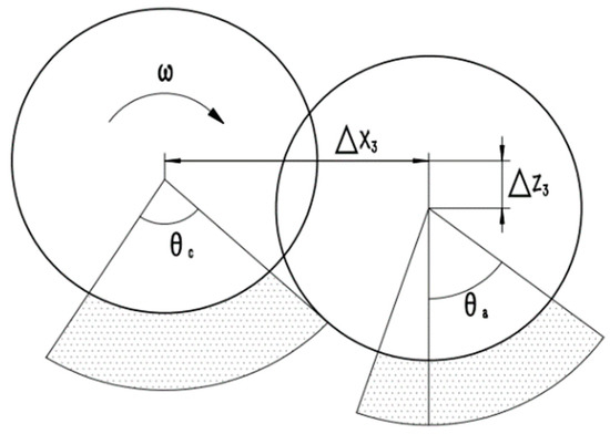 After drawing a schematic diagram of the tire slip and sink and analyzing Figure 4 to determine the slip and sink characteristics of the tire when driving, we can set the initial contact angle between the tire and the soil as θa, the rotation angle of the tire in the time as θa, and the slip amount as Δ × 3. We can then obtain
