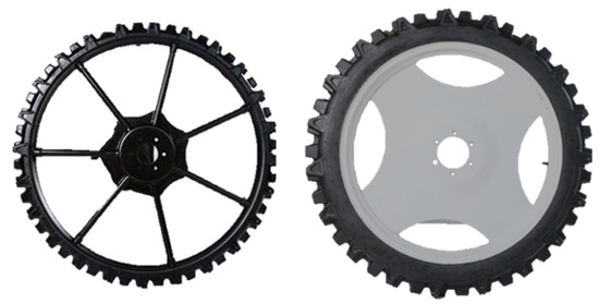 First of all, the sizes of the traction force and traction coefficient were compared and analyzed when solid rubber tires and pneumatic rubber tires were installed with the same parameters, respectively; the appearance of the tires is shown in Figure 6. The traction forces obtained from the two sets of tests were recorded separately, the wheel sinkage was measured, and the test data were processed to obtain the results shown in Figure 7.