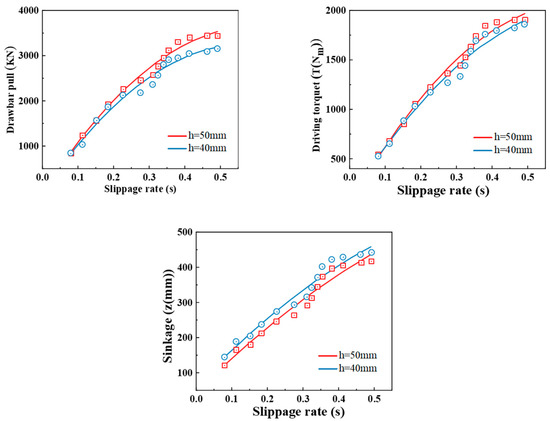 Solid rubber tires were selected to continue the comparative test analysis for tires of different wheel spur heights. In the case of other external environmental factors remaining unchanged, the outer rim of steel tires was directly added to welded angle iron to enable comparisons for different wheel spur heights for solid steel tires. The wheel spur height, h, was chosen to be 40 mm and 50 mm, respectively; the vehicle sinkage, driving torque, and hook traction were measured and recorded; and the predicted curves of the traction, driving force, and tire sinkage under different spur heights were obtained after the test data and line fitting calculation, as shown in Figure 8.