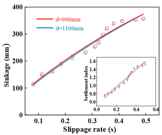 To investigate the influence of wheel diameter and wheel width on the performance of the whole machine, the experimental design was installed on the chassis of the high-ground-clearance operator, with wheel diameters of 900 mm (where n = 0.505 + 2.225 s) and 1100 mm (where n = 0.574 + 2.043 s), respectively, for field tests, and the data obtained were fitted and calculated to obtain the sinkage volume-fitting prediction data formed based on the slip rate. The sinkage volume law curve based on the change in slip rate is shown in Figure 9. It can be seen from the linearity of the fitted curve that the predicted relationship between the fitted slip rate and the sinkage volume is in good agreement with the actual test data, and it can be seen from the data that the fitted curve for the modified sinkage characteristics and the experimental values basically match.
