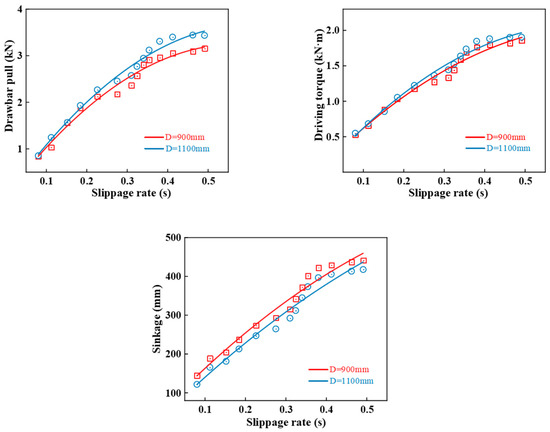 Using the aforementioned comparative test method, analysis of the sinkhole model data statistics was carried out for tires with wheel diameters of 900 mm and 1100 mm. The prediction curves obtained after the test data and fitting calculations are shown in Figure 10, and a comparative analysis of the traction characteristics, drive characteristics, and tire sinkhole volume of the high-ground-clearance truck could be performed: when the wheel diameter was changed from 900 mm to 1100 mm, the traction characteristics increased from 3.16 KN to 3.64 KN, with a 15.2% performance improvement; the driving characteristics (hydraulic motor feedback driving torque) increased from 1709 Nm to 1824 Nm, with a 6.7% performance improvement; and the maximum sinkage volume was reduced from 432 mm to 375 mm, with a 13.2% sinkage reduction.