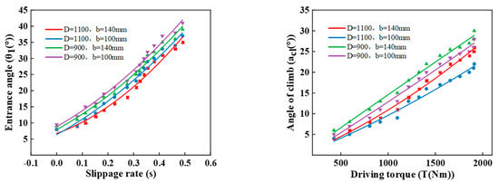 From Figure 11, it can be seen that as the tire width increases, even when the wheel diameter is the same, the soil cutting angle when the tire is moving decreases and the climbing angle subsequently increases. Within the test range, the larger the tire width, the better the performance in paddy fields. Therefore, one can choose to install a larger-width tire to improve the performance of the whole vehicle, but according to the actual operation of the high-ground-clearance planters, to avoid overwhelming the operation. If one chooses to move between the crop rows, the width should be smaller; wider tires may result in pressure being put on seedlings during driving, and the increased tire width will lead to an increase in the torque of the vehicle when turning, causing a greater burden on the hydraulic steering system of the high-ground-clearance machine. The tire width should be selected based on the maximum crop row spacing and all factors to ensure the stability of the vehicle based on stable driving, light steering, and no pressure on the seedlings.