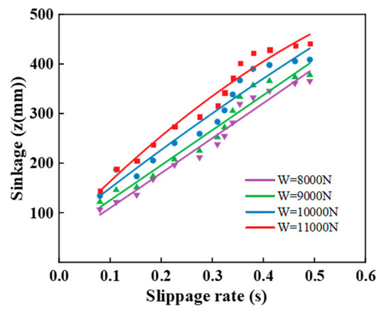 Based on the existing test conditions, keeping other parameters unchanged, by adjusting the mass of water in the water tank on the operating vehicle to control the vehicle load, the passing performance of the operating chassis under different load conditions was compared and analyzed, and masses of 8000 N, 9000 N, 1000 N and 1100 N, respectively, were selected to study and analyze the effect of the vehicle load on the wheel slip rate. The test data were calculated by line fitting, as shown in Figure 12, and the predicted curve from the analysis shows that when the load increases, the increased ratio of the wheel sinkage is smaller than the increased ratio of the traction characteristics, and it can be considered that the traction characteristics are more sensitive with the change in load. At the same time, the comparison found that the driving performance of the high-ground-clearance operation chassis is inversely proportional to the load change, and the reason for this finding is that the load increases and the sinkage increases at the same time, causing the chassis to increase its resistance when driving in the paddy field.