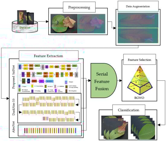 The proposed methodology consists of multiple phases of image processing. In the first step, as a preprocessing step, color spacing is performed on the images of the dataset. Images are converted from RGB color format to YCbCr color format. After getting preprocessed data, feature extraction is performed using two pretrained models and a newly proposed CNN deep model known as SidNet. This newly proposed model is based on 33 convolutional layers. This proposed CNN deep model is pretrained using the Plant-Village dataset, which consists of 38 classes. After pretraining, features are collected from the proposed CNN deep model. These extracted features are then fused with AlexNet and DarkNet-53 to find the best and most appropriate results. A deep CNN known as AlexNet was developed in 2012, which is an 8-layer deep model and consists of 5 convolution layers and 3 Fully Connected layers. After every convolution layer and fully connected layer, ReLU is applied. It contains a dropout layer, which is applied after the first and second fully connected layer. The input size in AlexNet is 227 × 227. In all layers, the activation function is ReLU. Softmax is designed as an activation function in the output layer. AlexNet is the simplest deep CNN model and it is used to get highly accurate results. DarkNet-53 is another used deep model, which works as the backbone for YoloV3 in object detection. It contains 25 layers for batch normalization and Leaky ReLU. The input size is 256 × 256 in DarkNet-53. In the second step, the feature sorting entropy algorithm is used for the selection of the best features. These selected core features are fused using serial-based fusion. After fusing the core features, the binary gray wolf optimization algorithm is used. Finally, these extracted fused features are provided to SVM and KNN classifiers for the classification of Leaf Blight for the best achievable results. The complete view of the proposed model is shown in Figure 1. It covers a complete view of the flow of the diagram of the designed structure.