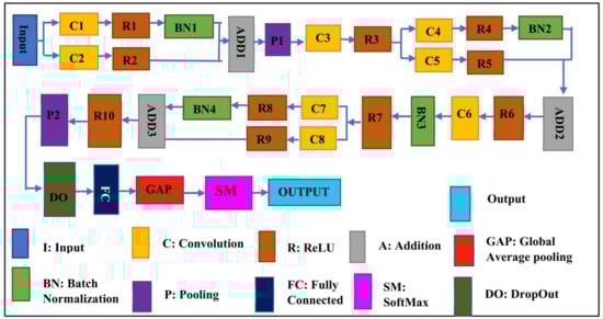 The proposed deep model named SidNet comprises 33 convolution layers. Its Input size is “227 × 227 × 3” and it contains 35 connections.