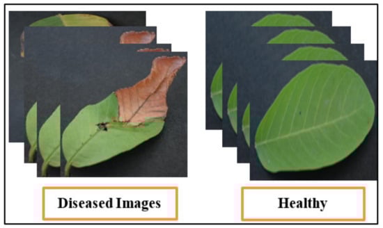 The assembled dataset for the classification of Leaf Blight used in this analysis [61] is small. These experiments are performed on guava leaves. The chosen dataset contains 415 guava leaf images in the original. This dataset contains a small number of images; therefore, they are augmented using horizontal and vertical flipping techniques, which increases the total number of images. The total number of images is 1000 after the augmentation technique. This dataset is publicly available on the Mendeley website. It is a binary class dataset (see Figure 7 for sample images) and many researchers have used it in their studies.