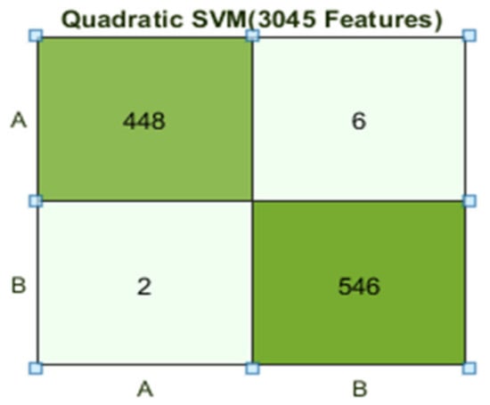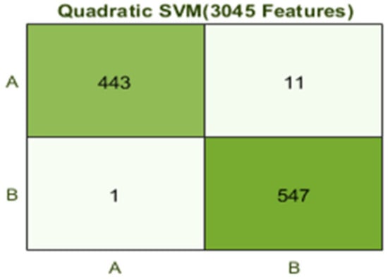 The Quadratic SVM classifier achieved the best result in comparison with all KNN classifiers, which is 99.2%. Here, the confusion matrix as presented in Figure 10 and the ROC curve are shown for the best results against the Quadratic SVM classifier.