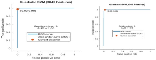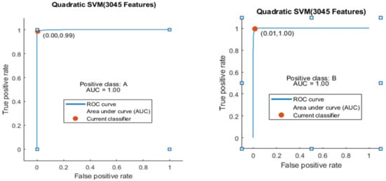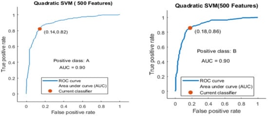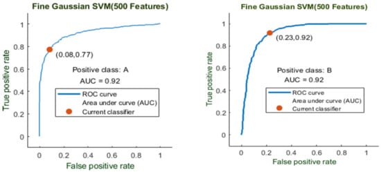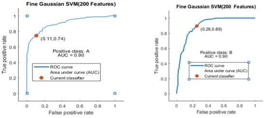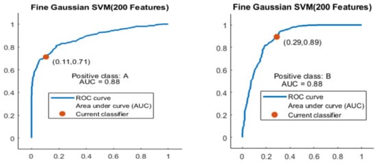 Here, the ROC curve is shown in Figure 11 for both classes A and B, which are presented as ROC A and ROC B.