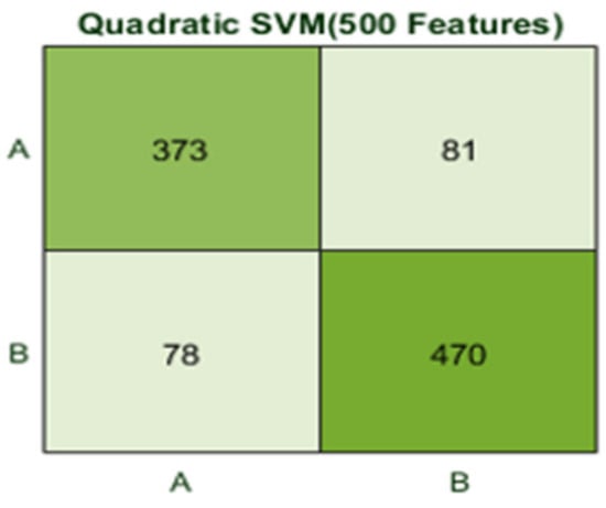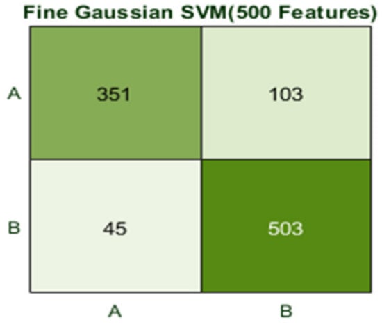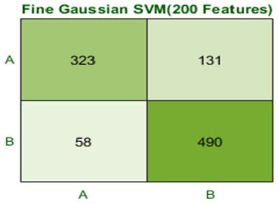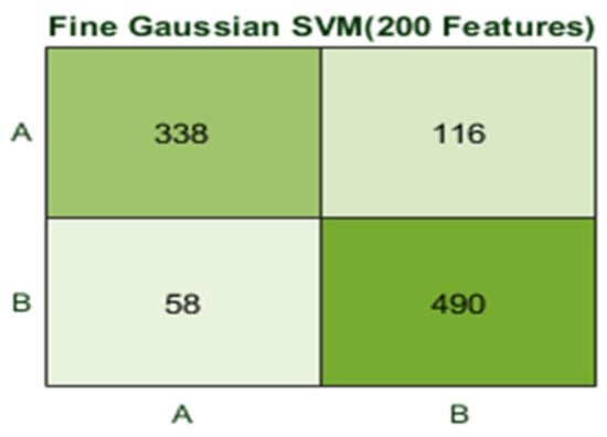 Here, the classifier Fine Gaussian SVM achieved the best result in comparison with all KNN classifiers, which is 85.2% in 2.2 s. Here, the confusion matrix and the ROC curve are shown for the best results against the Fine Gaussian SVM classifier. The confusion matrix for FG (SVM) is shown in Figure 18.