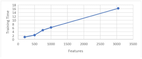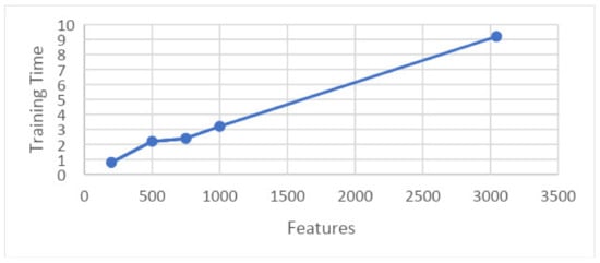 Here, features are presented on the x-axis and the training time is shown on the y-axis. These results are taken on 5-folds for the best achievable results.