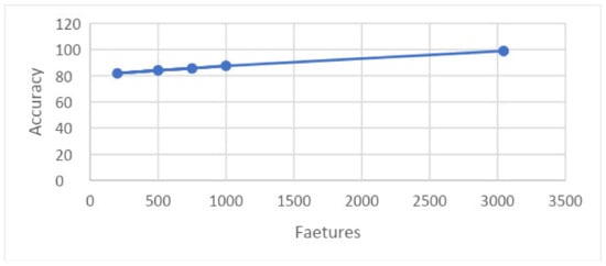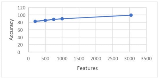 Similarly, the graph in Figure 21 shows the relation between accuracy and features at 5-fold results. It shows that the features are presented along the x-axis and the accuracy is presented along the y-axis, and the line presents the best achievable results.