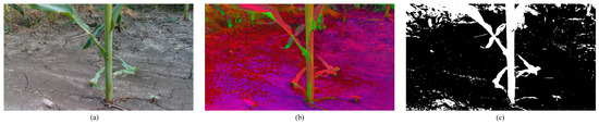 Image processing of maize at the small bell stage: (a) field maize image; (b) hue saturation value (HSV) color space image; (c) HSV + maximum between-class variance (Otsu) image.
