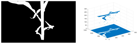The stem contour of the maize was extracted from the complex field environment by using the HSV + Otsu algorithm. The reference method was used to relate the 3D experimental scenes with the 2D images. The flow chart of stem diameter measurement is shown in Figure 5.