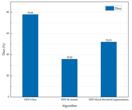 Figure 7, Figure 8, Figure 9 and Figure 10 show that the processing result of the HSV + Otsu algorithm was closest to that of the manual segmentation effect. Figure 11 shows that the values of the Dice coefficient of the HSV + Otsu algorithm, the HSV + K-means algorithm, and the HSV + fixed threshold algorithm were 78.06%, 35.82%, and 52.03%, respectively. The results show that the HSV + Otsu algorithm is the optimal choice to extract the stem contour of maize.