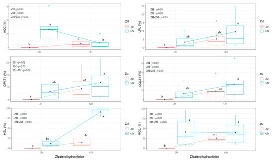Relative expression of mRNA enzymes acetyl CoA carboxylase (ACC), lipoprotein lipase (LPL), glycerol 3 phosphate acyltransferase (GPAT1) and diglyceride acyl transferase (DGAT1), sensitive hormone lipase (HSL) and monoglyceride lipase (MGL), in muscle fat Longissimus dorsi of intensive fattening sheep supplemented with zilpaterol hydrochloride (ZH: 0 or 0.2 mg kg−1 LW) and zinc methionine (ZM: 0 or 80 mg kg−1 DM). a,b,c, Different letters in different boxes indicate significant difference (p < 0.05; p < 0.01).