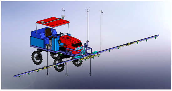 To achieve precise localization of the spraying system between crop rows, a visual row-oriented spraying platform with autonomous navigation was built based on a high-clearance sprayer. As shown in Figure 1, the test platform consists of a navigation system, vision system, row alignment control system, sliding boomer, application supply system and travel chassis. The antennas of the navigation system (AMG-1202, National Agricultural Intelligent Equipment Engineering Technology Research Center, Beijing, China) are symmetrically installed on both sides of the test platform. The vision system uses a network camera (LPCP10190_1080P, Xinjiahua Electronics Co., Ltd., Shenzhen, China) with an image resolution of 1920 × 1080 pixels, a focal length of 2 mm and a monitoring angle of 90°. The camera is installed at the center of the front of the test platform, and the installation angle is 60° to the ground. The key component of the row alignment control system is an electric linear actuator (TG-300B, Shenzhen Bosgoal Technology Co., Ltd., Shenzhen, China), and the maximum stroke of the electric actuator corresponds to the plant row spacing. The width of the sliding boomer is 12.2 m, providing 22 spraying locations, and the maximum height from the ground is 1.4 m. A three-cylinder plunger pump was selected for the application supply system, with a liquid pump flow rate of 36~81 L/min and a spraying pressure range of 0.05~0.6 MPa. The travel chassis uses a four-wheel drive, with a wheel track of 1.6 m and a chassis height of 1.2 m, ensuring the stable operation of the platform in the high-clearance spraying environment.