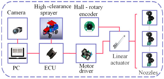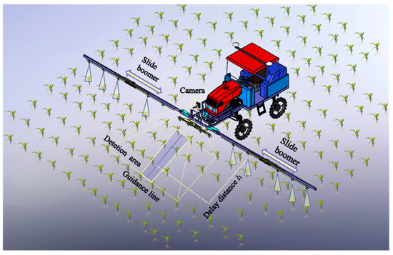 A high-clearance sprayer equipped with an autonomous navigation system can preliminarily align the drill plants [28,29,30]. The visual row-oriented principle is shown in Figure 2. The camera transmits the collected images to the computer, and then the computer calculates the angle information and offset information of the crop rows through the crop row identification algorithm and sends them to the electronic control unit (ECU). The speed encoder of the high clearance sprayer provides the traveling speed v of the test platform, and the ECU analyzes the delay control time t according to the row-oriented delay model, and triggers the control signal. The motor driver applies pulse-width modulation (PWM) to control the reciprocating movement of the sliding boom, and the Hall encoder on the electric linear actuator obtains the alignment offset in real time and feeds it back to the ECU, thereby adjusting the lateral movement of the nozzle and achieving closed-loop control of the sliding boom.