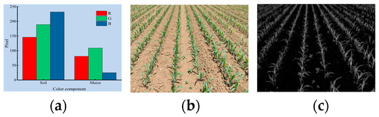 Image pretreatment is the key step of crop row extraction in a field, aiming to completely segment the plants from the soil and obtain the characteristic plant information. To explore the effect of changing light on color channels, 100 groups of R, G and B color channel pixel values for maize and soil were measured under different light conditions. The statistical results in Figure 4a show that the brightness of the soil B channel was higher than that of the R and G channels, and the brightness of the maize G channel was much higher than that of the R and B channels. Therefore, the segmentation algorithm adopted the coupled G-R and G-B channel characteristics, thus improving the traditional Excess green algorithm, and the maize image in Figure 4b was converted to grayscale. To reduce the influence of illumination, the values of the R, G and B channels were normalized, and the processed results were replaced using the existing color channels r, g and b. The mathematical expression is shown in formula (1). The grayscale image is shown in Figure 5c.