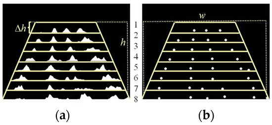 Because the camera shoots at an inclination angle, the crop row images obtained were not parallel to each other, so it was necessary to use vertical projection to divide the horizontal strip in the ROI to obtain feature points. It is known that the image size is w × h, the width is w, the height is h, the strip size in the ROI is w × Δh, and the number of strips in the ROI is m = h/Δh. To obtain enough feature points, m was set to 8. The independent contours in each strip were traversed from left to right and the geometric centroid of all contours was found as the feature point coordinates [31]. One strip was regarded as a group, and feature points of the strip were stored in the queue. The visualization results of the features are shown in Figure 6.