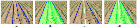 As shown in Figure 16, the leaf area, shape and density of plants in different growth periods were different. As shown in Table 1, the proportion of target pixels corresponding to the growth height was calculated, showing that it increases with the growth period. Moreover, when the maize grows to 30 cm and 40 cm, the identification success rate of the algorithm is higher, but when it grows to 80 cm, the identification success rate is difficult to guarantee. Because the leaf spacing of maize is clear and complete at heights of 30 cm and 40 cm, it can be clearly distinguished between plants and soil. At a height of 80 cm, the leaves were obviously enlarged, and overlapped with each other, close to “ridge sealing”, increasing the difficulty of the morphological operation and thus affecting the identification success rate. Because the image acquisition period is in the dry season, the weed pressure is low, and the weeds in the field are mostly Inula and Portulaca oleracea, with an average weed density of 34 plants·m−2. The algorithm uses the Hough transform to extract crop rows and reduces the influence of weed noise, so the identification success rate is not affected by weed density. The test images were collected all day, and the coverage of light intensity was 4.57~11.36 wLux, basically meeting the needs of agricultural production in various periods. As shown in Table 1, when the illumination range is too large, the identification accuracy decreases. Excessive exposure will increase the preprocessed target pixels, and the obtained feature points will be inaccurate, thus affecting crop row extraction. In addition, the algorithm running time for 180 experimental images was less than 44 ms, meeting the real-time extraction requirements. The tests of different growth periods and light intensities of maize showed that the identification success rate of the algorithm was above 90.0% when the growth period of maize was in the third stage (30 cm) and the early jointing stage (40 cm), and the light intensity ranged between 4.57~11.36 wLux. This result indicated that the identification algorithm had good robustness and real-time performance and basically met the field operation requirements of the whole maize seedling period.