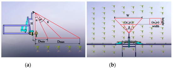 Visual row alignment control was carried out as follows. After obtaining the guidance information, the image coordinates of the guidance line aiming point were converted into the actual coordinates in the world coordinate system to provide guidance information to the control system. According to Figure 9a, the camera was arranged above the crop canopy at a fixed height and shot at an inclination angle to the ground. H is the height of the camera from the top of the canopy, Dmin is the actual distance between the bottom edge of the image and the camera, Dmax is the actual distance between the top edge of the image and the camera, α is the camera pitch angle and θ is the vertical angle of the field of view. According to the geometric relationship of the above parameters, the equivalent relation Formula (5) is presented. ∆θ and θ were linearly related to the actual coordinates in pixel coordinates, so the actual ordinate y1 of the aiming point was obtained according to Formula (5).