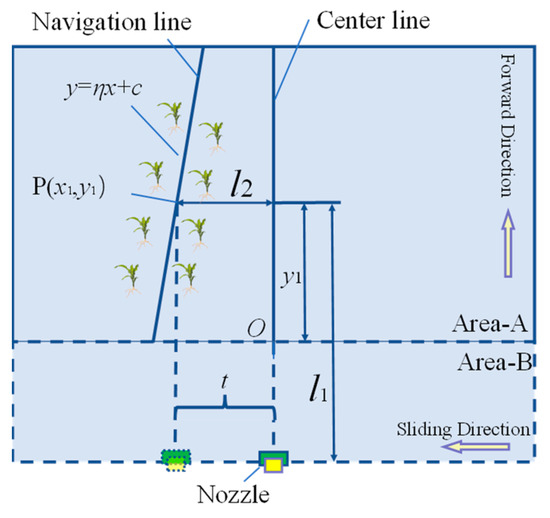Precise row alignment control requires that the system incorporate guidance information to establish a row-oriented delay compensation model. As shown in Figure 10, area A is the image field of view, area B is the blind area of the field of view, the guidance line is y = ηx + c, and the lateral distance l2 of the nozzle is the relative abscissa x1 from the aiming point P to the absolute coordinate system O on the guidance line. As shown in Figure 11, the camera was installed at the centerline of the front end of the test platform, and the spraying nozzle was installed on the sliding boom. There was a distance between the aiming point of the camera and the spraying nozzle in the vertical direction, that is, the longitudinal distance l1 between point P and the spraying nozzle. Therefore, it can be inferred that when the linear actuator receives the execution signal, it cannot execute immediately, so it needs time delay control. First, the execution time of the system components was theoretically analyzed, and the theoretical delay compensation time theory of the row-oriented control system was obtained. The compensation time includes identification and localization time t1, communication time t2, and execution time t3 for the bank mechanism, wherein the identification and localization time t1 was 32 ms on average after repeated tests using the GetTickCount() function. In addition, the visual row-oriented control communication mode used USB-to-CAN packet mode, with a serial port baud rate of 115,200, a fixed packet length of 16 bytes and a communication time t2 of 1 ms [33]. At the same time, the stroke of the linear actuator was 500 mm, the theoretical speed was 240 mm/s, and the maximum theoretical execution time t3 was 2.08 s. To ensure the motion stability of the linear actuator, it was necessary to set a speed safety boundary for the delay compensation time model according to the theory. Only when the time taken to advance the implement l1 meets the speed safety boundary condition can the sliding boom perform the completion offset D. Therefore, a delay compensation model of the row-oriented mechanism was established, and the speed obtained by the encoder on the test platform is v, so that the delay execution time t of the linear actuator can be obtained according to Formula (7).