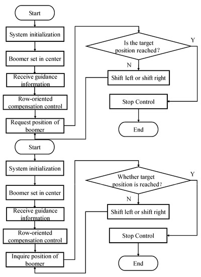 To reduce the frequent start and stop of the DC motor and increase its service life, PWM full-speed regulation was adopted. The technical flow chart of the control system is shown in Figure 12. First, the system is initialized, the ECU triggers the timer, and the sliding boom moves to the middle of the stroke so that the boom is aligned with the center of the vehicle. Second, the ECU circularly receives the guidance information, analyzes the serial port data, and enters the delay control through the above row-oriented delay compensation model. The electric linear actuator encoder provides feedback on the position of the sliding boom in real time, and the ECU requests and calculates the difference between the target position and the previous position of the sliding boom. When the calculation result is less than the target position, the sliding boom shifts to the left, and when it is greater than the target position, the sliding boom shifts to the right. If the sliding boom reaches the target position, the motor stops moving, and the control ends.