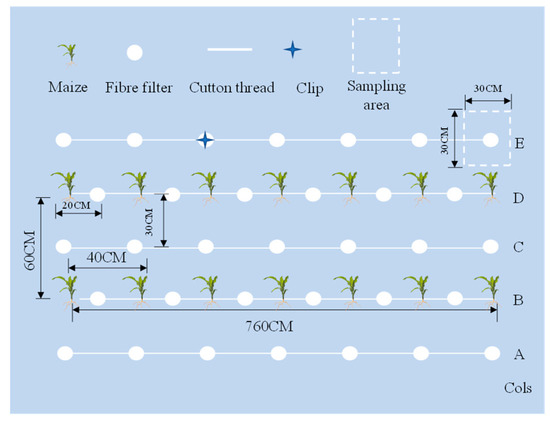 A comparative test between full-coverage spraying and row-oriented spraying was designed to explore the droplet deposition of the two conditions. According to the planting requirements, two rows of plants were arranged in the field, with 20 maize plants in each row, and 98 pieces of round fiber filter with a diameter of 9 cm were arranged between rows and plants. As shown in Figure 14, the filter paper center of mass was used as the sampling center, and a square of 30 cm × 30 cm was taken as the sampling area for droplet deposition. The spraying deposition amount in the sampling area is the product of the deposition amount per unit area on each filter paper and the sampling area. The site layout is shown in Figure 18. To reduce the droplet deposition between crops, a 110° fan nozzle was selected for full-coverage spraying, and a 40° fan nozzle was selected for row-oriented spraying. The test process is as follows: start the spraying system, set the spraying pressure at 0.27 MPa, then drive the sprayer at a speed of 0.5 m/s at a constant speed along the crop row direction. After the spraying operation, the fiber filters were quickly collected into a washing dish for droplet deposition determination.